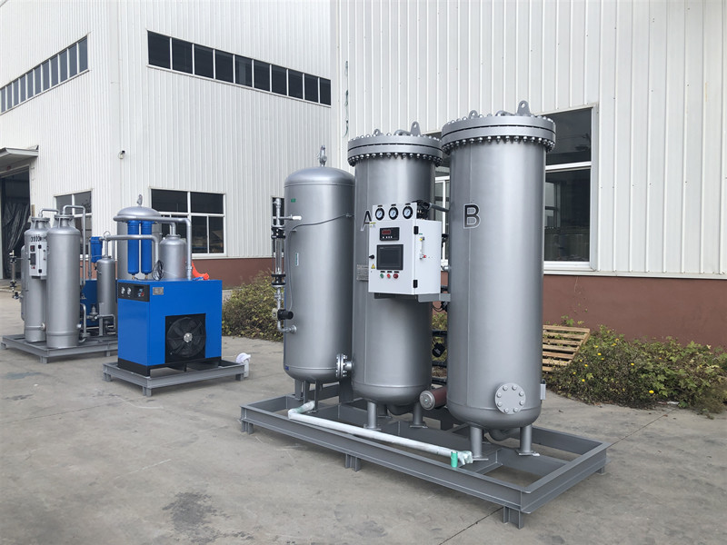 變壓吸附制氧裝置以潔凈的壓縮空氣為原料,采用高品質(zhì)的沸石分子篩作為吸附劑,在一定的壓力下,從空氣中制取氧氣。經(jīng)過純化干燥的壓縮空氣,在吸附器中進行加壓吸附、減壓脫附。由于空氣動力學(xué)效應(yīng),氮在沸石分子篩微孔中擴散速率遠大于氧,氮被沸石分子篩優(yōu)先吸附,氧在氣相中被富集起來,形成成品氧氣。然后經(jīng)減壓至常壓,吸附劑脫附所吸附的氮氣等雜質(zhì),實現(xiàn)再生。一般在系統(tǒng)中設(shè)置兩個吸附塔,一塔吸附產(chǎn)氧,另一塔脫附再生,通過PLC程序控制器控制氣動閥的啟閉,使兩塔交替循環(huán),從而取得純度較高的氧氣(93%±3%)。